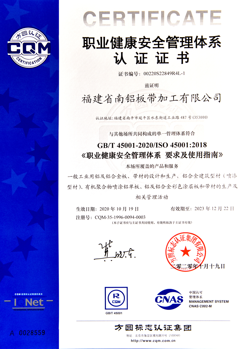 職業健康安全管理體系認證證書--南鋁板帶