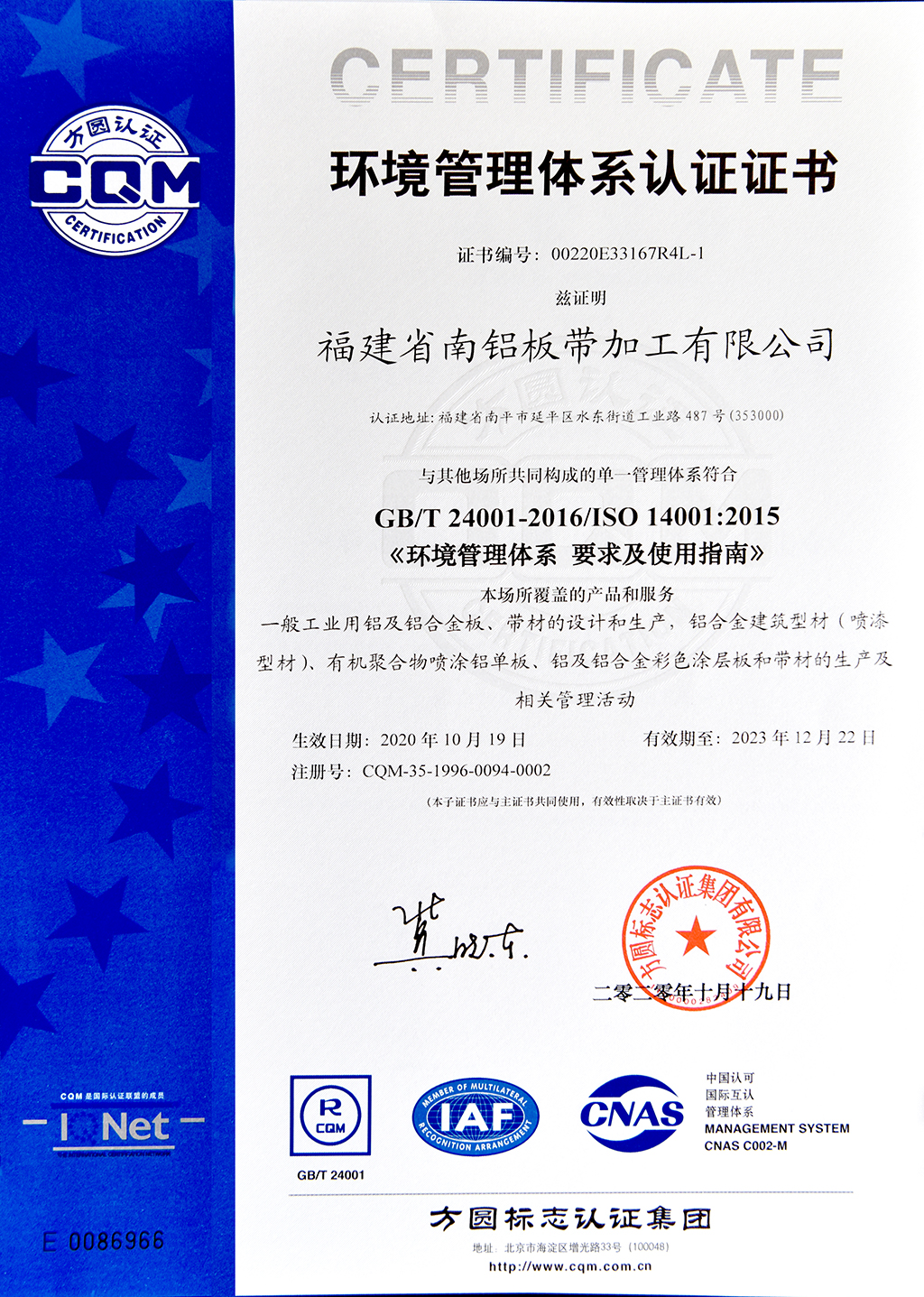環境管理體系認證證書--南鋁板帶